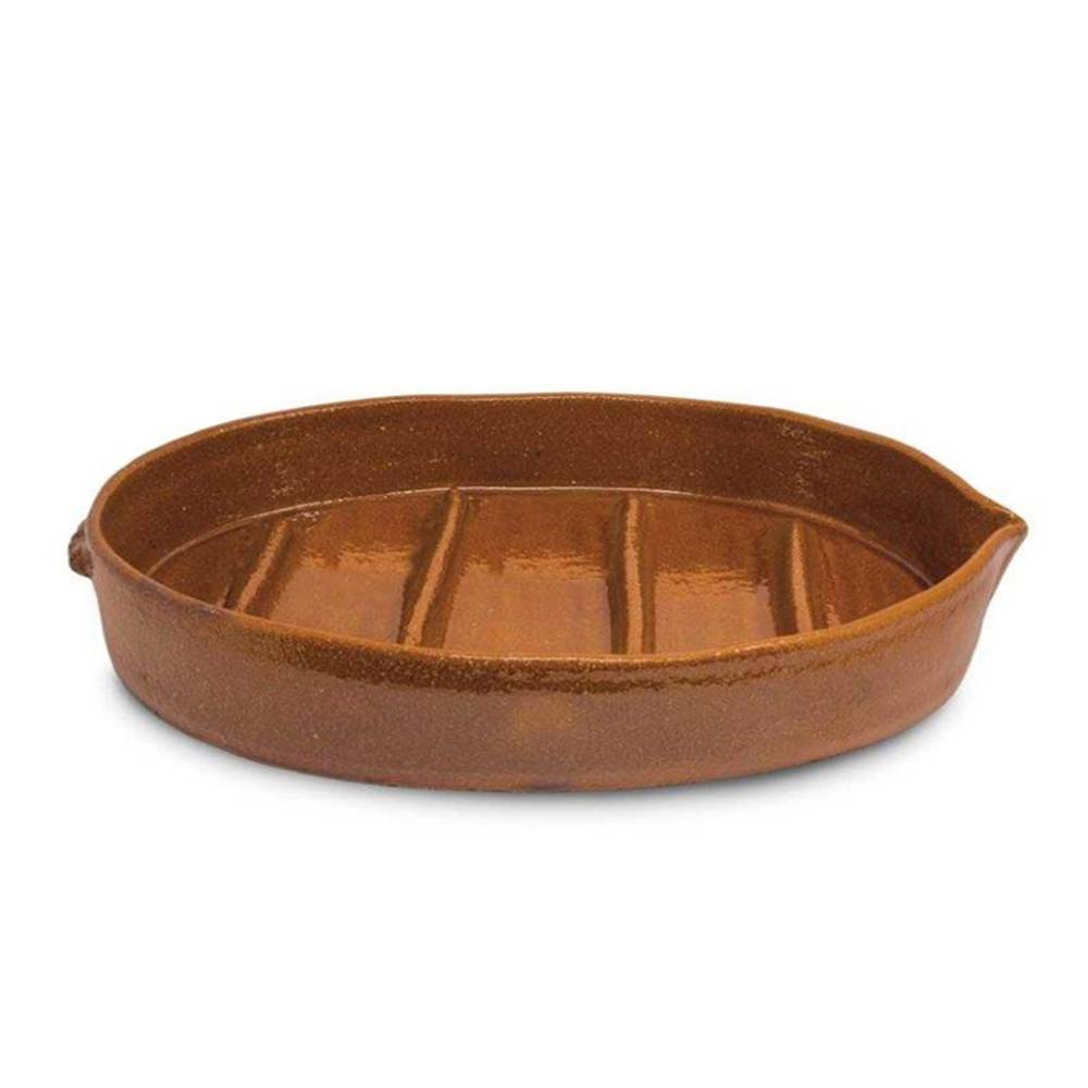 The handmade fluted Oval clay tray is intended for professional and private use. The fluted tray prevents the meat from drying out by reducing contact with the tray itself. Given its conductivity properties and resistance to high temperatures, it obtains unbeatable results in any type of roasts and stews: meats, fish, rice, lasagna, etc.