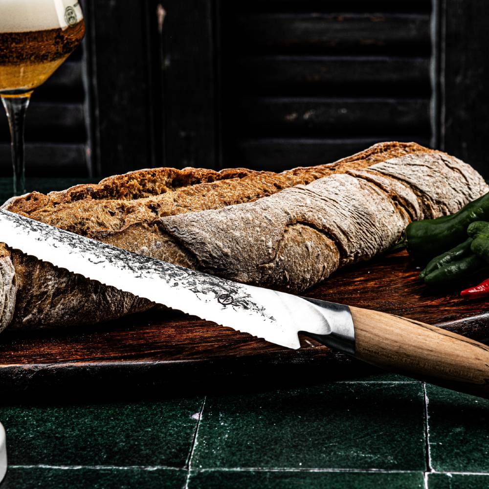 The Forged Katai bread knife has a long and serrated blade, ideal for cutting baguettes or quiche, for example. In addition, it is also perfect for cutting larger vegetables or fruits such as melon, pumpkin or pineapple. The Forged Katai knives are made of Japanese VG10 steel with a hardness of 60 Rockwell. All Forged knives are forged by hand, which makes each one unique. The blades have a blade thickness of 2 mm and a cutting angle of 18 degrees. Packed in a luxurious wooden box. With a 10-year warranty.