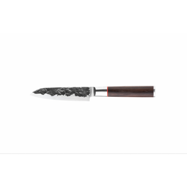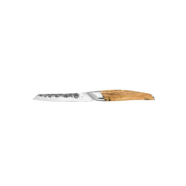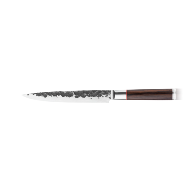 Wave-like shapes were used as a source of inspiration for the design. This is reflected in the shape of the blade and how this transitions into the handle. The blade is completely forged by hand in 5 layers of Japanese VG10 steel. The hammer stroke on the blade is essentially the same as the other series. However, it has undergone additional post-processing with the help of a very fine hammer. This way of processing is a lot more intensive, but it results in a refined look with a completely unique appearance. In turn, the handle is made of root wood. The wood is first filled with resin, then pressed and subsequently modelled. Because of this process, each knife is unique in finish, size, color and wood structure.