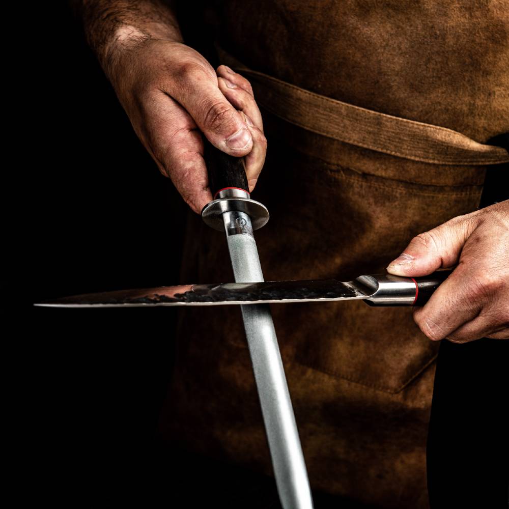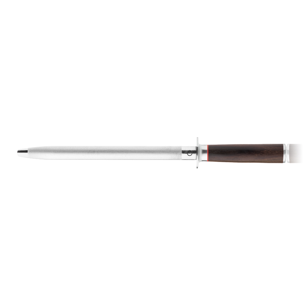 The Sebra diamond honing steel does not sharpen the knife, but it makes sure that the burrs on the blade are smoothed out again, which keeps the blade sharp. By running down the knife a number of times along the honing steel, it will get sharp again. It's important to keep the knife in the same angle at all time. In a luxury box. With a 2 year warranty.