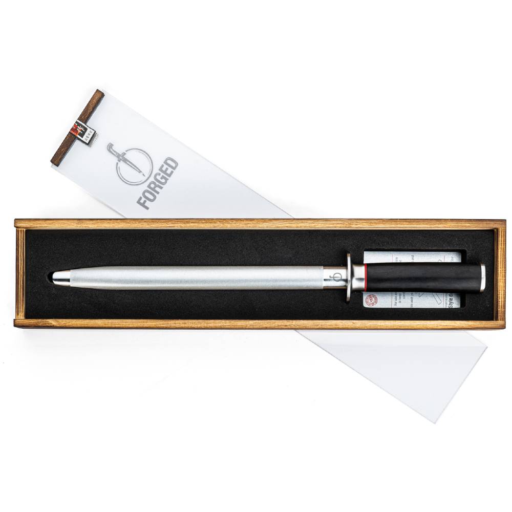 • The knives can be maintained with the accompanying sharpening steel from Forged. It has been specially designed for this purpose and offers a high quality sharpening steel that is oval in shape and has a diamond coating.