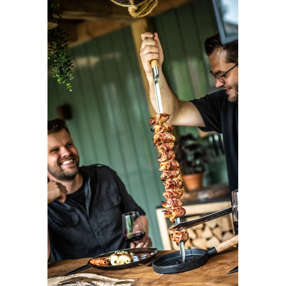 The Olive V-shaped Skewer is manufactured of high-quality steel in combination with olive wood. The handle has a round to oval shape and is made of olive wood. This makes it very comfortable to hold. Thanks to its sharp points, you can easily thread any piece of meat, vegetable or fruit onto your skewer, and the V-shape of the skewer ensures that it stays firmly in place during grilling and serving. Churrasco descends from the time of the gauchos (cowboys in southern Brazil) who grilled meat on skewers over hot coals in the ground. The Churrasco series by Forged allows everyone to experience this sensation and style at home.